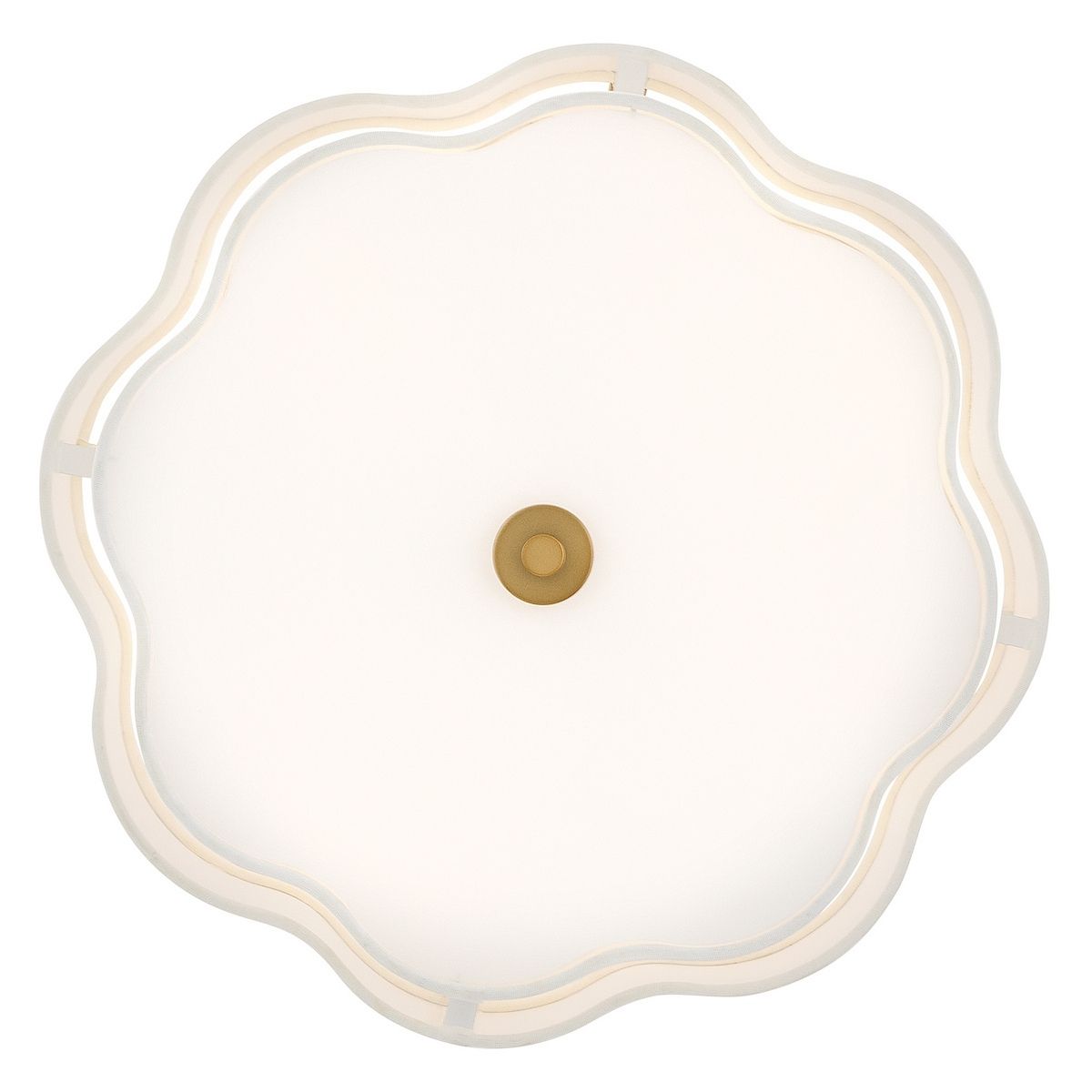 Splendidly soft, Gwen’s shapely scalloped shade complements inviting light with elegant layers of offwhite linen suspended from delicate chains and minimal metal stems. A Black or Lacquered Brass finish provides a versatile complement to any interior style.