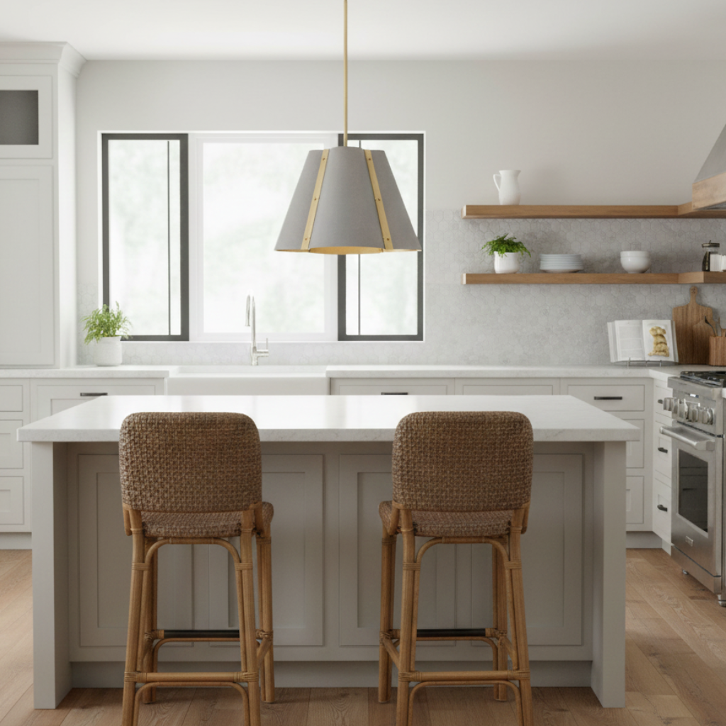 Strong in style and design, Bowman’s makes a transitional statement with a tapered quatrefoil shade accented by decorative knobs along symmetrical vertical supports. Heritage Brass or Slate Bronze finishes complement any living or dining décor with polished metallic tones.