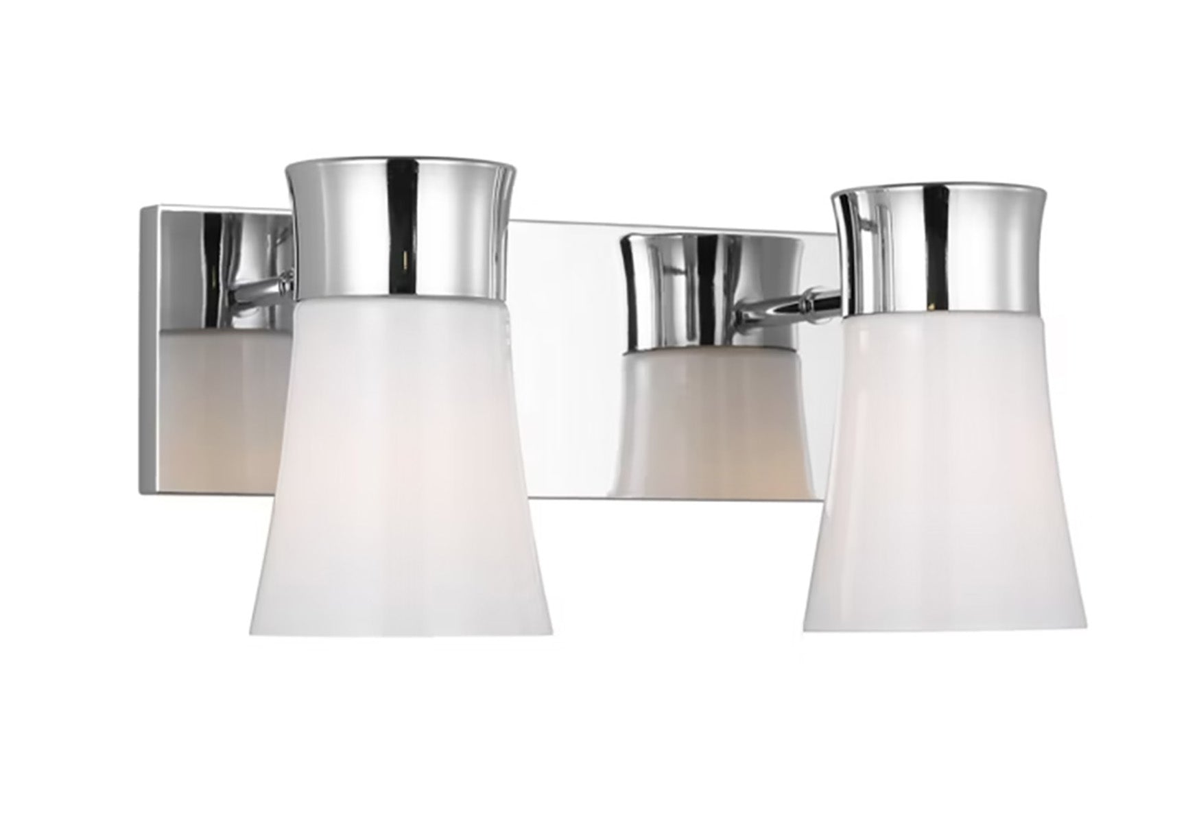 The Roy 2-Light Vanity by Drew & Jonathan features two softly flared milk glass shades that deliver a warm, ambient glow. Paired with a minimalist square backplate, this design creates a chic, modern look. Available in Satin Brass, Midnight Black, or Chrome, and damp-rated for use in steamy spaces, it’s a perfect fixture for contemporary bathrooms, offering both style and function.