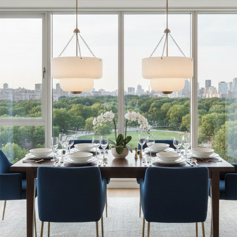 A clean design with traditional styling, Adella’s fine-ribbed glass shade creates a soft silhouette accented by fine details, delicate chains, and a sleek flared canopy. A Lacquered Brass finish complements Etched Opal or Smoke glass, accenting your living space with a distinguished aesthetic