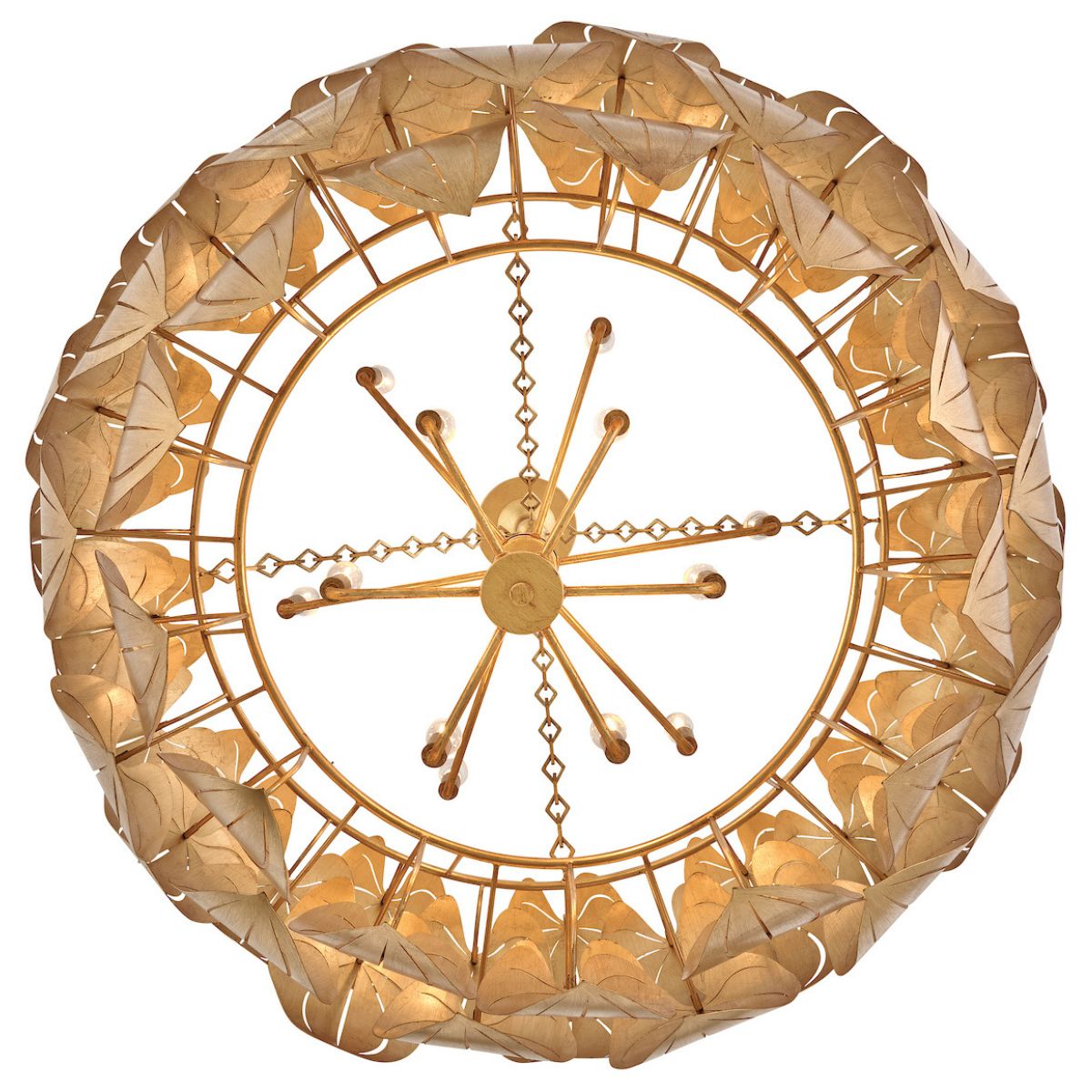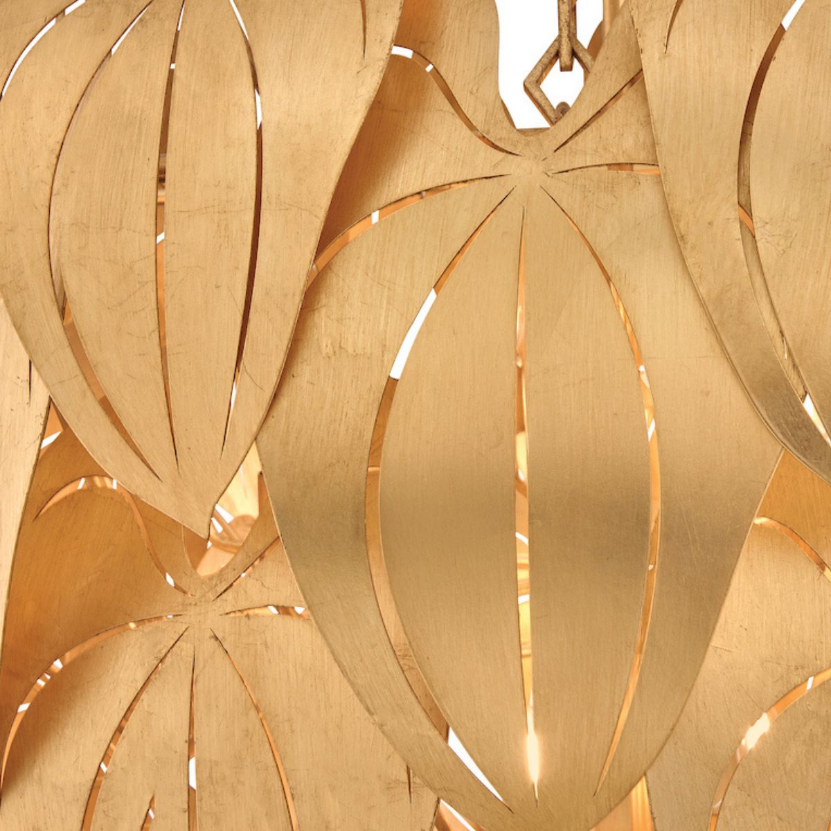 Inspired by the grand leaves and distinct veining of anthurium plants, found in the tropical cloud forests of South America, Camille brings botanical beauty to your living space. Each Distressed Brass layer is artfully laser-cut, shaped, and hand-painted with gold leaf to create a luxe transitional design, suspended by diamond-shaped chains and a tapered canopy.