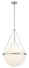 Fusing a sculpted, modern form with classically styled details, Collins features a transitional teardrop shade crafted from blown, cased opal glass. A central metal band and delicate chain uprights are available in Heritage Brass or Black Oxide finishes.